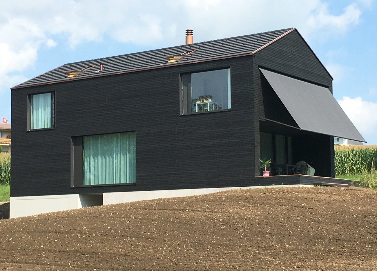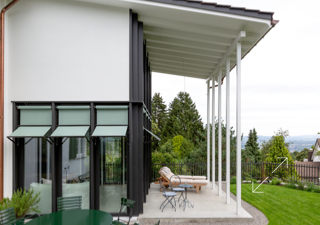 Die aussenliegende Fassadenmarkise bietet je nach Textilie einen Sichtschutz und ist ein wesentlicher Beitrag zum Schutz gegen die sommerliche Wärme.