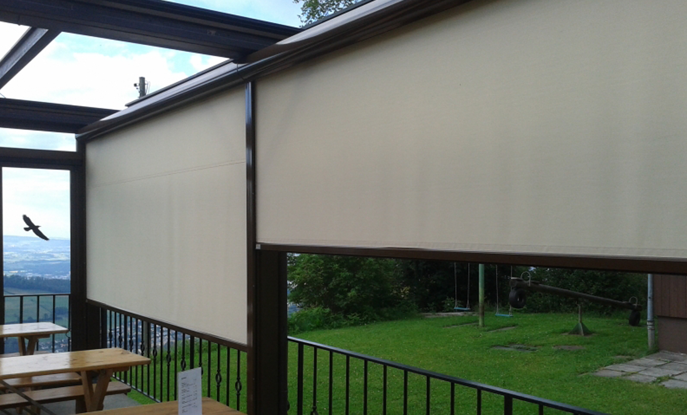 Schon seit Jahren verfügt das Bergheim über eine Terrasse, welche mit einer Faltstore gegen Sonne und Regen geschützt ist. Es zeigte sich aber bald, dass der Wind vom Tal her, welcher immer wieder für Druchzug sorgt, so nicht eingedämmt werden kann. Aus diesem Grund wurde der Terrassenschutz schon früh mit einer Glaswand erweitert.