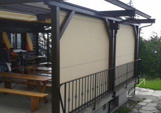 Dies reichte aber nicht aus, immer noch klagten Gäste über zu viel Wind, und auch bei Regen war der Schutz ungenügend. Aber eine zweite Glaswand war keine Option. Zwei nebeneinander montierte ZIPLINE sorgen nun für weniger Durchzug und somit für einen angenehmeren Aufenthalt. Die Terrasse kann so als zusätzlicher Raum genutzt werden, welcher die Kapazität des Bergheims merklich erhöht. Es können nun viel mehr Gäste unabhängig vom Wetter bewirtet werden. Die Senkrechtstoren fanden lobende Erwähnung im Jahresbericht 2014 des Hüttenchefs.