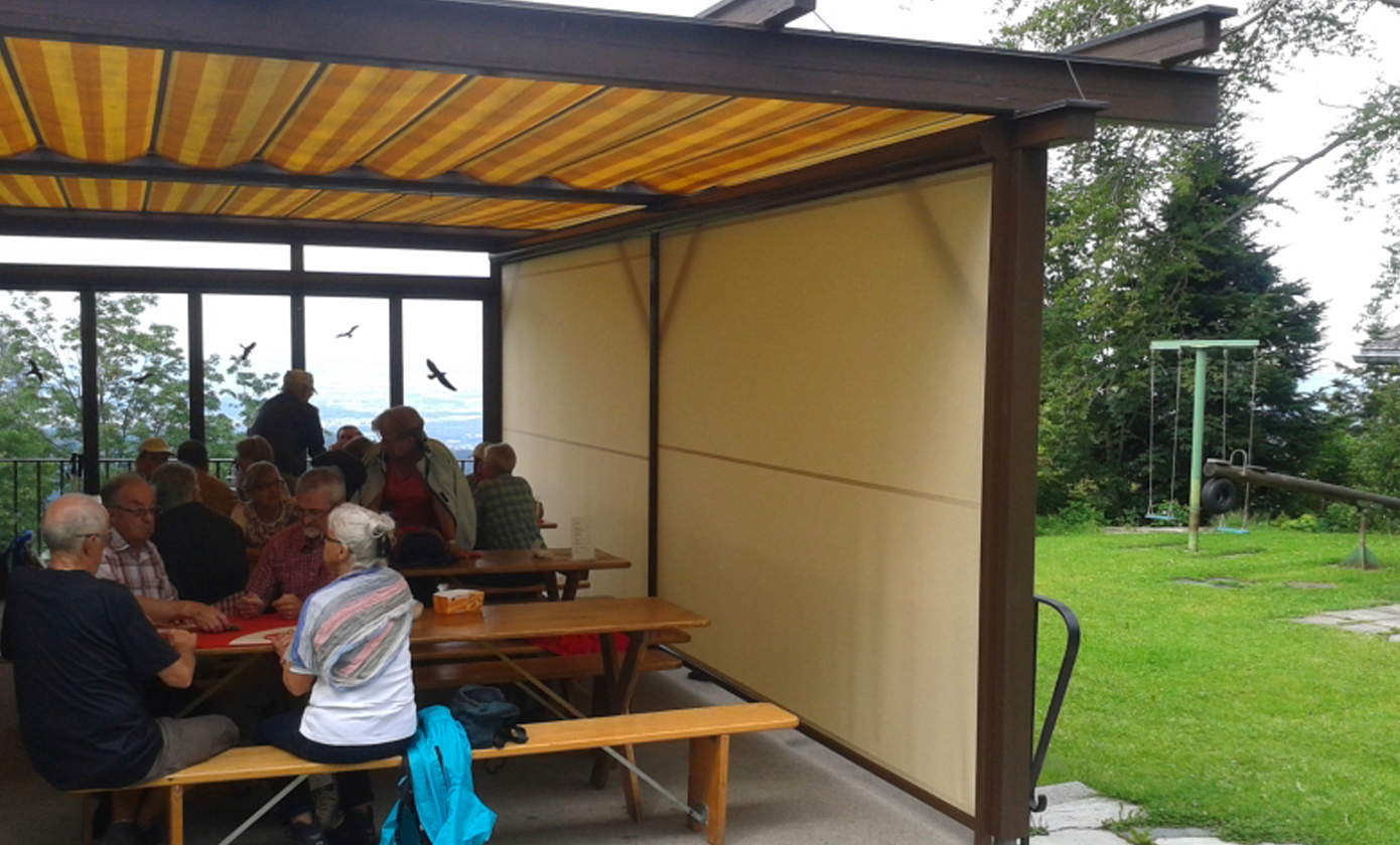 Schon seit Jahren verfügt das Bergheim über eine Terrasse, welche mit einer Faltstore gegen Sonne und Regen geschützt ist. Es zeigte sich aber bald, dass der Wind vom Tal her, welcher immer wieder für Druchzug sorgt, so nicht eingedämmt werden kann. Aus diesem Grund wurde der Terrassenschutz schon früh mit einer Glaswand erweitert.
