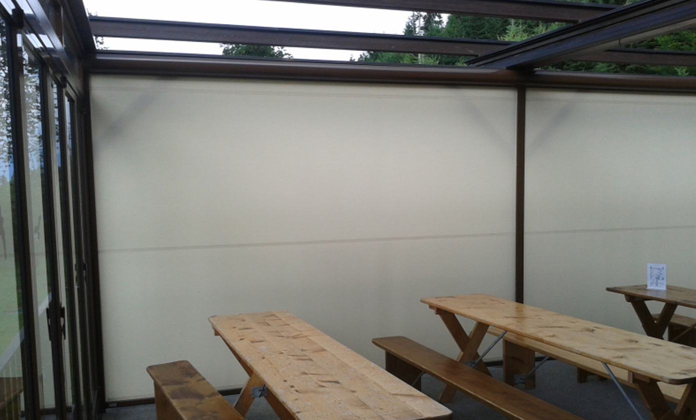 Dies reichte aber nicht aus, immer noch klagten Gäste über zu viel Wind, und auch bei Regen war der Schutz ungenügend. Aber eine zweite Glaswand war keine Option. Zwei nebeneinander montierte ZIPLINE sorgen nun für weniger Durchzug und somit für einen angenehmeren Aufenthalt. Die Terrasse kann so als zusätzlicher Raum genutzt werden, welcher die Kapazität des Bergheims merklich erhöht. Es können nun viel mehr Gäste unabhängig vom Wetter bewirtet werden. Die Senkrechtstoren fanden lobende Erwähnung im Jahresbericht 2014 des Hüttenchefs.