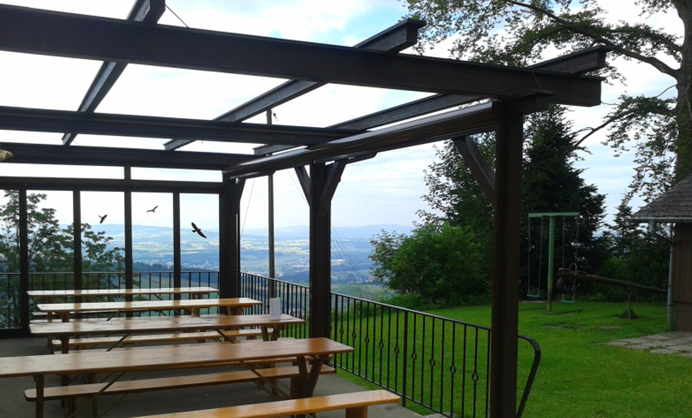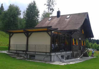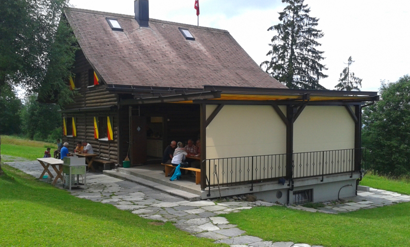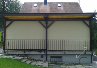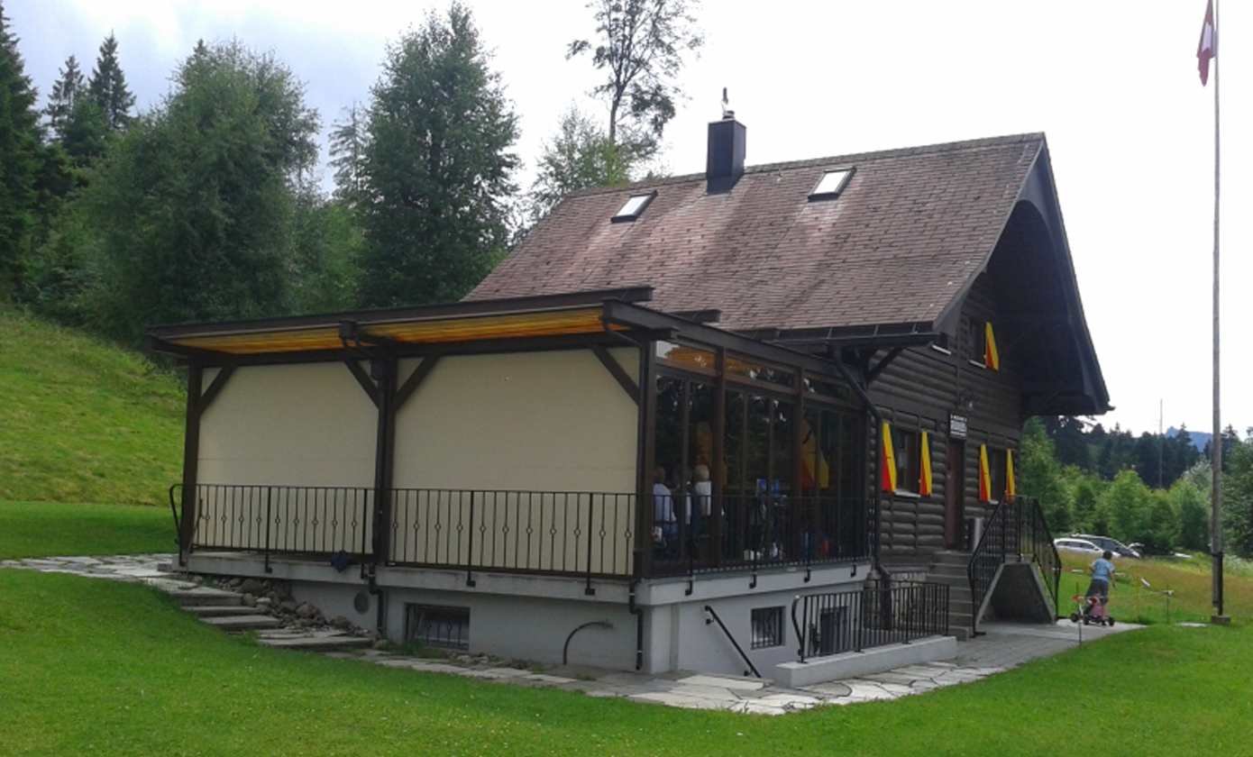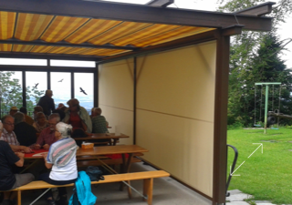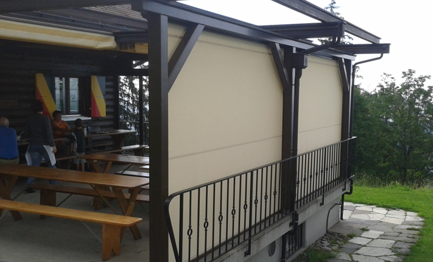 Schon seit Jahren verfügt das Bergheim über eine Terrasse, welche mit einer Faltstore gegen Sonne und Regen geschützt ist. Es zeigte sich aber bald, dass der Wind vom Tal her, welcher immer wieder für Druchzug sorgt, so nicht eingedämmt werden kann. Aus diesem Grund wurde der Terrassenschutz schon früh mit einer Glaswand erweitert.