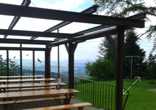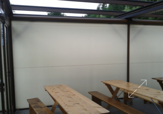 Dies reichte aber nicht aus, immer noch klagten Gäste über zu viel Wind, und auch bei Regen war der Schutz ungenügend. Aber eine zweite Glaswand war keine Option. Zwei nebeneinander montierte ZIPLINE sorgen nun für weniger Durchzug und somit für einen angenehmeren Aufenthalt. Die Terrasse kann so als zusätzlicher Raum genutzt werden, welcher die Kapazität des Bergheims merklich erhöht. Es können nun viel mehr Gäste unabhängig vom Wetter bewirtet werden. Die Senkrechtstoren fanden lobende Erwähnung im Jahresbericht 2014 des Hüttenchefs.